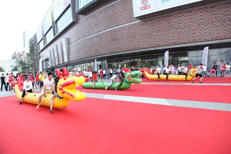 活动现场气氛异常活跃,“旱地龙舟趣味赛”得到了广大市民的积极参与,男女老少纷纷组团报名,六人一队,三队一组,发令后大家双腿跨骑在充气龙舟上,手提龙舟把手,“一二一,一二一……”在旱地上“划船”,使龙舟向前,向前,再向前。