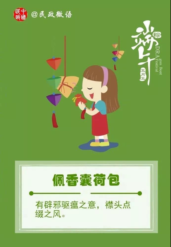 端午节小孩佩香囊,传说有避邪驱瘟之意,实际是用于襟头点缀装饰。香囊内有朱砂、雄黄、香药,外包以丝布,清香四溢,再以五色丝线弦扣成索,作各种不同形状,结成一串,形形色色,小巧可爱,现已成为一种普遍的工艺品。在中国某些南方城市,青年男女还用香囊来表达浓浓爱意。