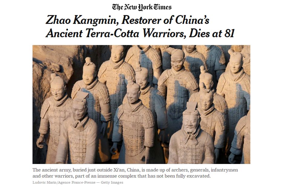 《纽约时报》发文:赵康民,中国兵马俑修复者去世。