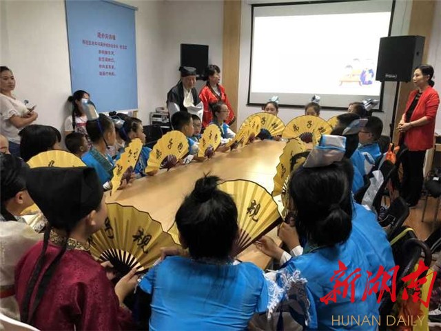 身着汉服,手持折扇。课堂上,来自桂花树小学、车站南路小学、湘教幼儿园、万婴幼儿园的小朋友们“穿越”成了汉代小书生。赤岗社区关工委“德嗲育苗协会”刘德尧爷爷,为孩子们带来了第一课。听古稀老人讲中国故事,吟颂古诗,习练书法……孩子们的心灵得到净化,满满的正能量激励他们奋发向上。