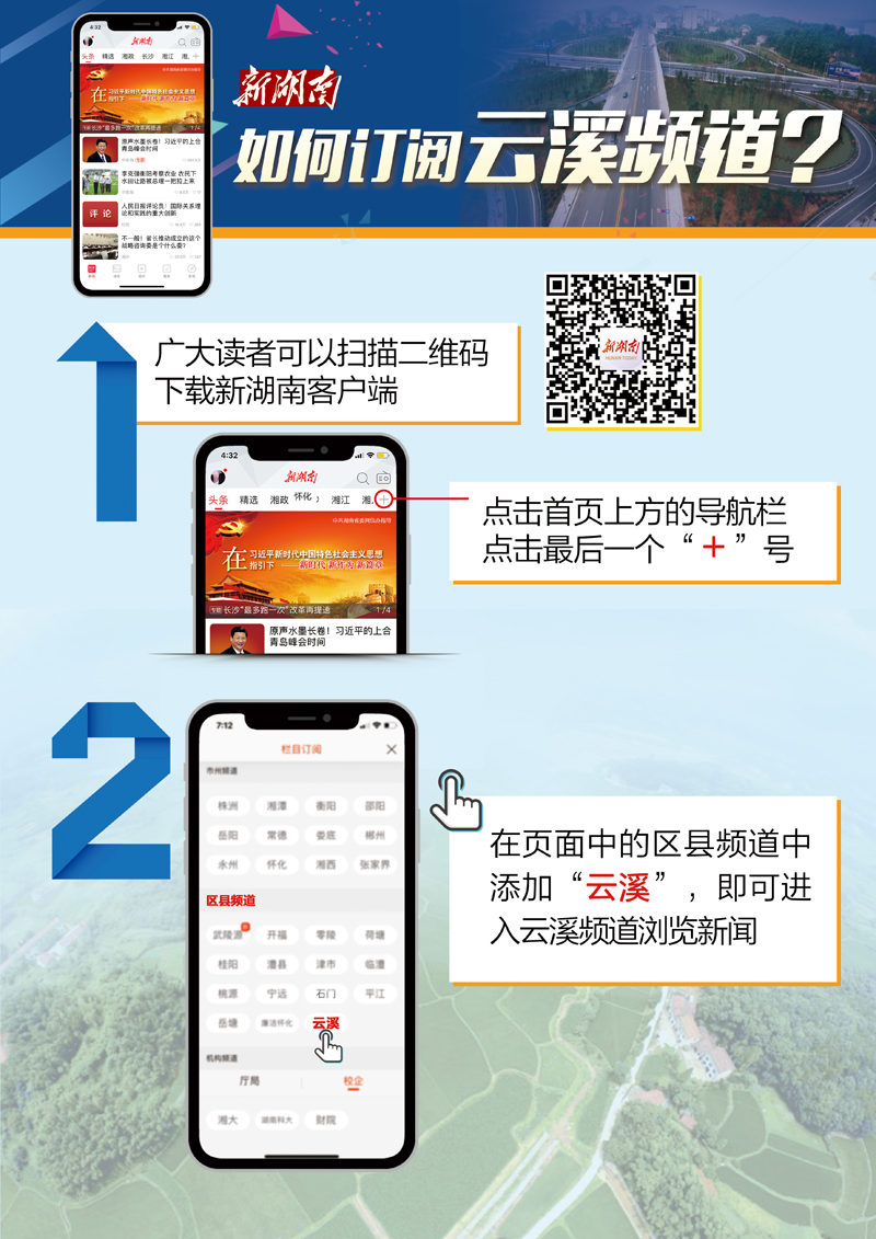 怎样进入新湖南云溪频道、阅读新闻咨询呢?广大读者可以下载新湖南客户端,点击首页上方的导航栏,点击最后一个“+”号,在页面底端的机构频道点击“区县”,添加“云溪”,即可进入云溪频道浏览。