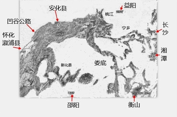 安化县—溆浦县的公路,蔓延于地质断裂带的主要凹谷线,地图上的这条公路比较清晰地画出了龙躯北段的边界。