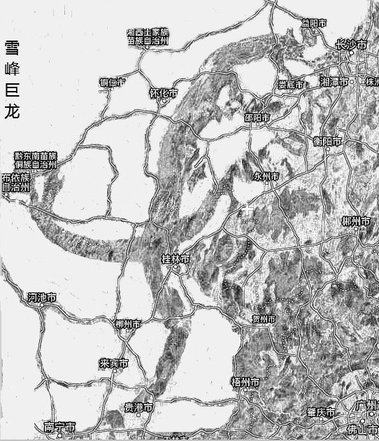 值得说明:这一系列的接续式山脉组,在谷歌地图上看得不是很清楚,在传统的广西地形地势绘图上,很清楚。旅游部门若绘画雪峰巨龙,最好是结合两类地图。
