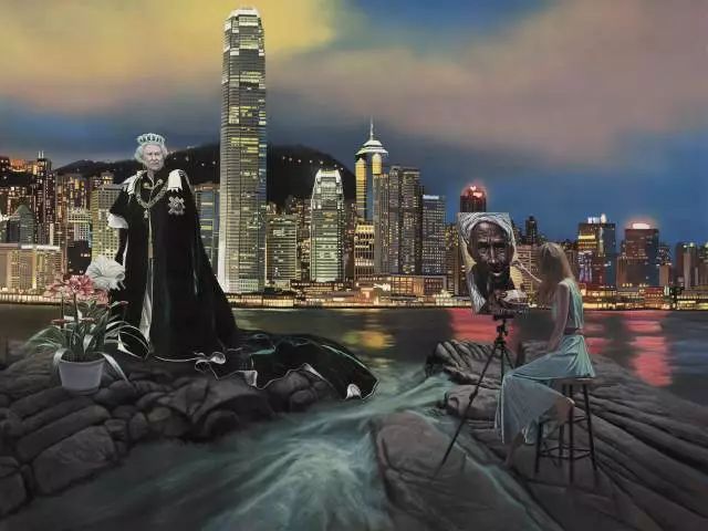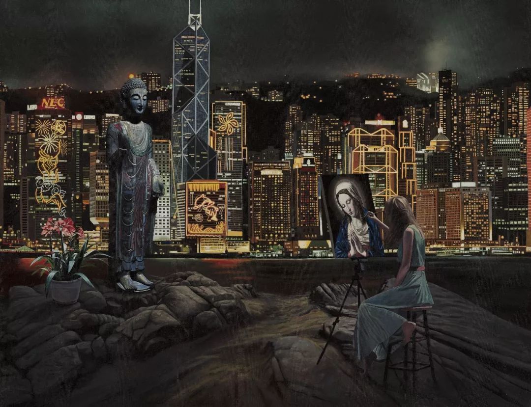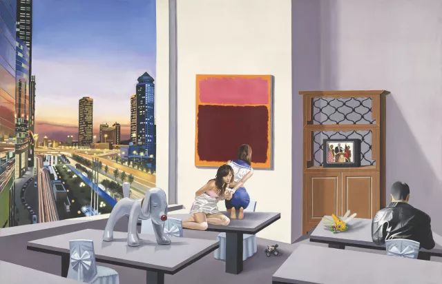 他:对。它既不是写实,也不是超现实。我们画面的景物看着都很真实,但就是透过一种荒诞性与失调的状态,让人家感觉到这是绘画而不是一张照片或者图片。