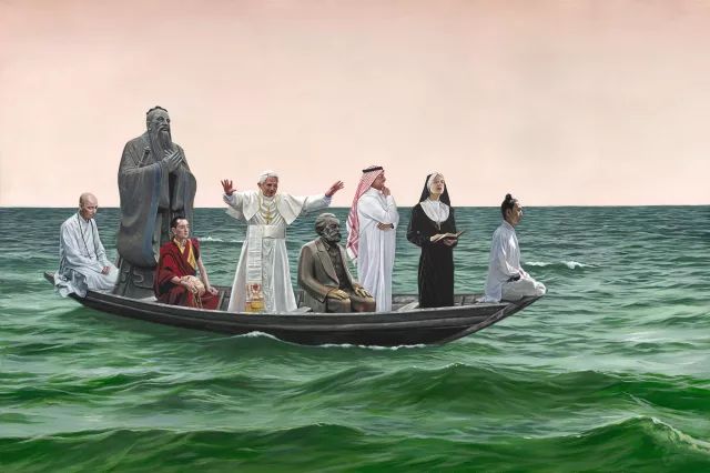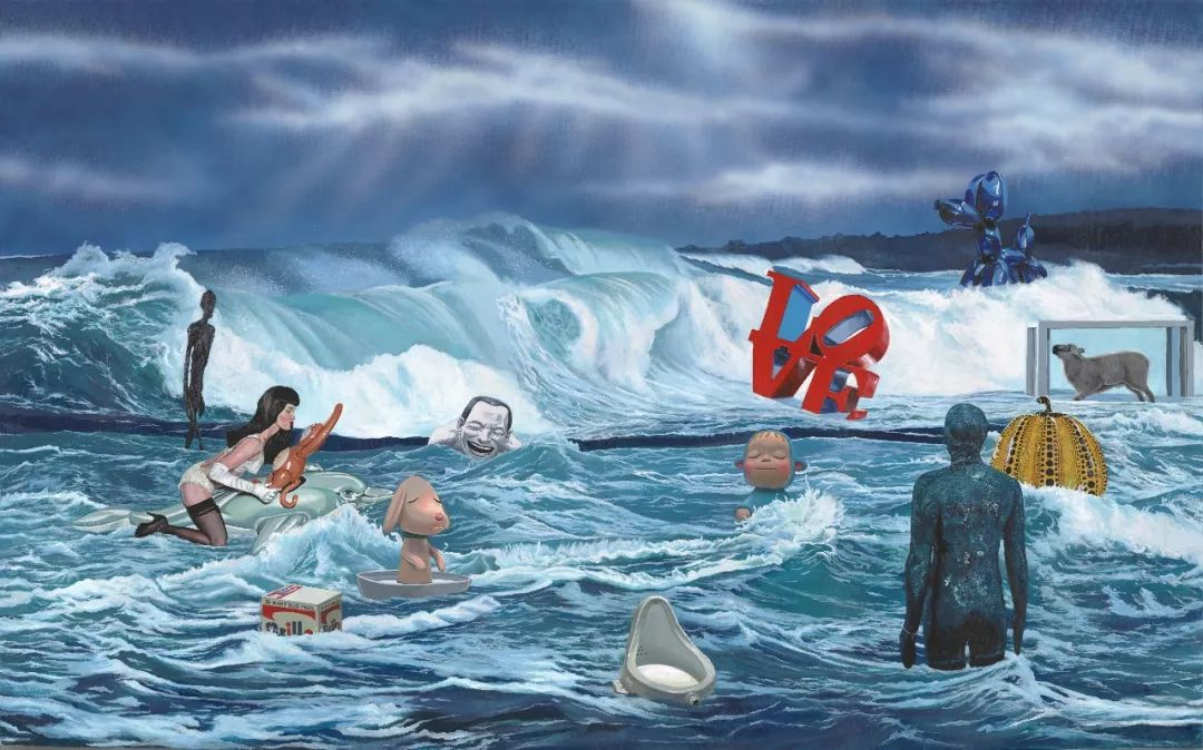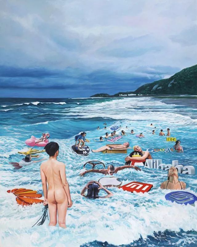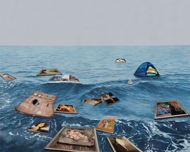 他:不是挪用,这点我要稍微否定一下。我们上学时就了解后现代主义典型的手法,像是用拼贴,或者再加个胡子之类的,这个还是比较浅层次的。我们不是挪用,是植入,我将它放到里面后,它只是我的一个配角。像是我们的一张画《漂浮的美术史》,是海面上漂了很多艺术史的材料,但裡面还有一张我们早期的画作。我们没有把自己放到某种距离外,大家都是一体的。挪用是会有一种调侃或戏谑,我们没有,就是真实地把那些图像放进去,既没有致敬也不调侃、嘲讽。它就只是一个元素,就好像我们画一个苹果一样。只是故事里需要一个形象、一个角色出现。
