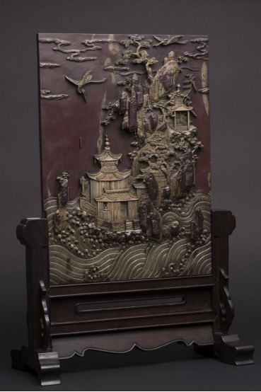 沅洲石山水插屏也是一件特别的旧藏,插屏为沅洲石质,造型古朴典雅,屏面巧借沅洲石中的页层岩质彩石巧雕福寿齐天图,寓意福寿双全。整器取材精良,设计新颖,画面布局疏朗有致线条优美,包浆自然,镌雕精巧细致,为文房至珍。沅洲石产于芷江县明山,该石质地均匀细腻,色彩纷呈,文理清晰,软硬适度,成板性能好,是历代理想的石雕工艺和建筑装饰材料,曾被定为贡石送往朝廷。早在南宋时期,芷江人民就开始利用明山石制作各种工艺品。