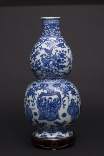 这件万历年制的青花葫芦壁瓶,瓶口微敞,束颈,葫芦形圆鼓腹。胎质坚致厚实,釉色肥润闪青。壁体满绘,自上至下施以青花材料绘制主题人物纹和装饰性花纹。图案繁密,场景热闹。主题纹饰为拜相图,可见中间一人,端坐高背椅上,手执灵芝,头戴冠,道骨仙风,四周站满着官服之人,展现了当时帝王追捧道教之风。此瓶青花色,绘笔拙朴老练,局部有晕染等效果营造出深浅渐变的立体感。背面款识大“明万历年制”,为神形,以莲叶为座,荷叶为盖,甚为新颖,较为罕见。