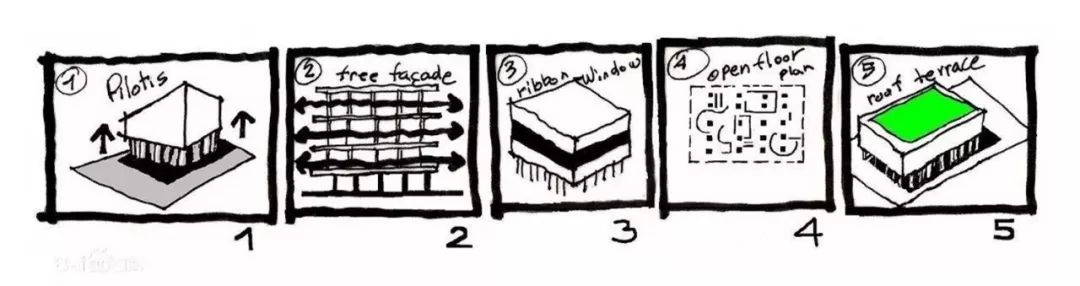 柯布提出的新建筑五点:底层架空、自由立面、水平长条窗、开放平面、屋顶花园。