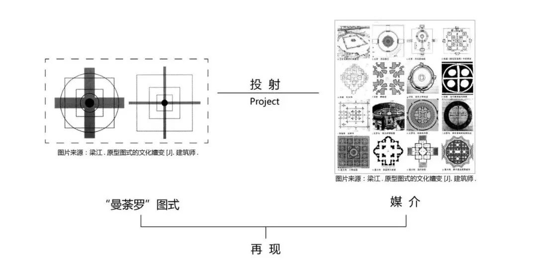 在建筑史上,许多建筑在建造时都是相对独立的,但后来的研究者发现它们有着共同的几何形式:最早的曼陀罗图式原型,由近代瑞士心理学家荣格发提出,强调其以中心点、十字、圆形、方形等几何形式相互结合,并共享一中心的抽象完形,而其通过“投射”过程,在不同的历史建筑中得到再现。