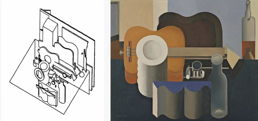 柯布在1920年代的一幅画中,将许多东西挤压并置在了一起。我们如果把画中内容的结构打开,利用柯林·罗的透明性解读这幅画的图式语言,可以看出图中被拉开的各种层次。
