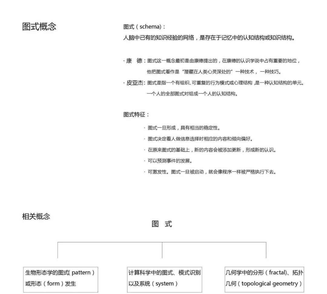 而认知心理学的代表人物让·皮亚杰认为,图式是指一个有组织、可重复的行为模式或心理结构,是一种认知结构的单元,一个人的全部图式将组成一个人的认知结构。在当代科学中,与图式相关的概念有许多,比如计算机科学中的系统(system),或者是几何学中的分形(fractal)等。