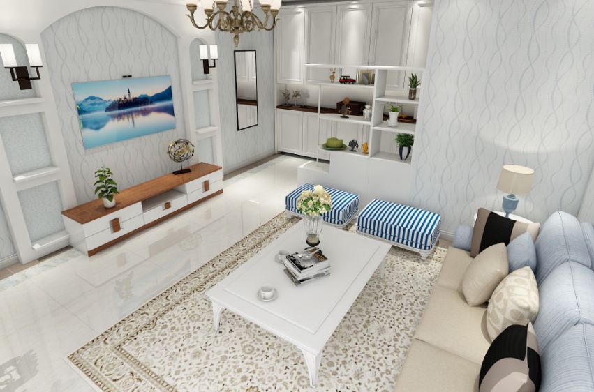 在墙面和柜壁空间上适合摆放多一些浅蓝色装饰,浪漫柔和的色调柔化着整体色彩的视感。