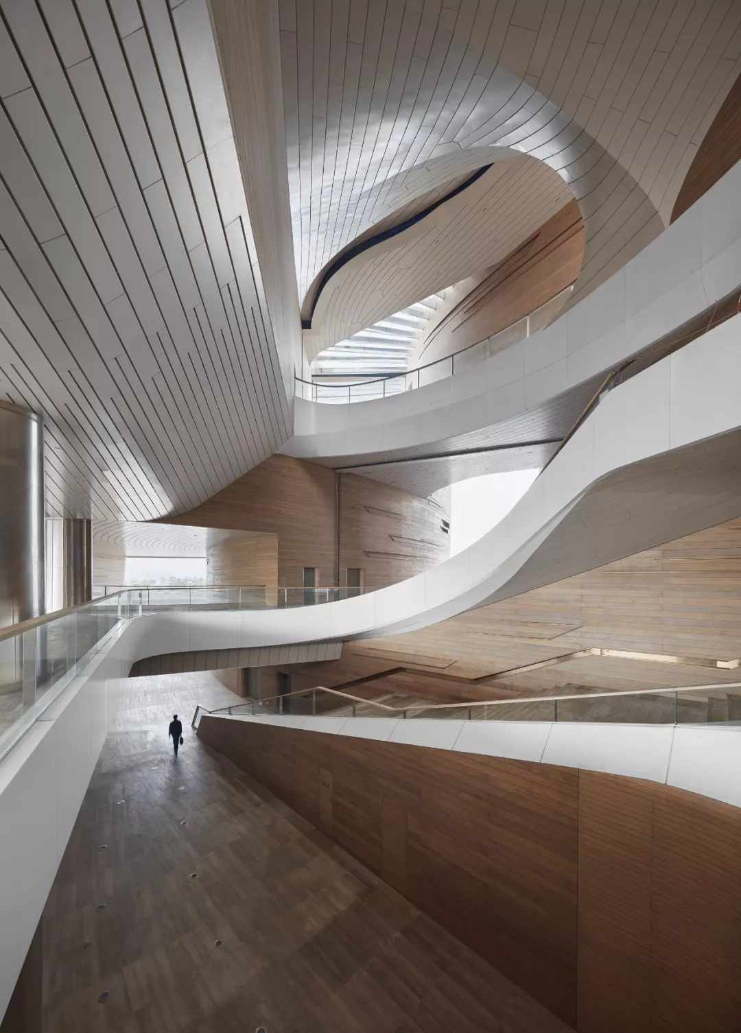 大楼天窗及东西侧开口保证了充足的自然采光,营造出舒适的氛围和光影交错的效果。这些空间还采用木质板材饰面,营造出有如水上游艇的奢华之感,因为大部分游艇船身采用高强度碳纤维,而甲板上铺设的也是这种柔软材质。