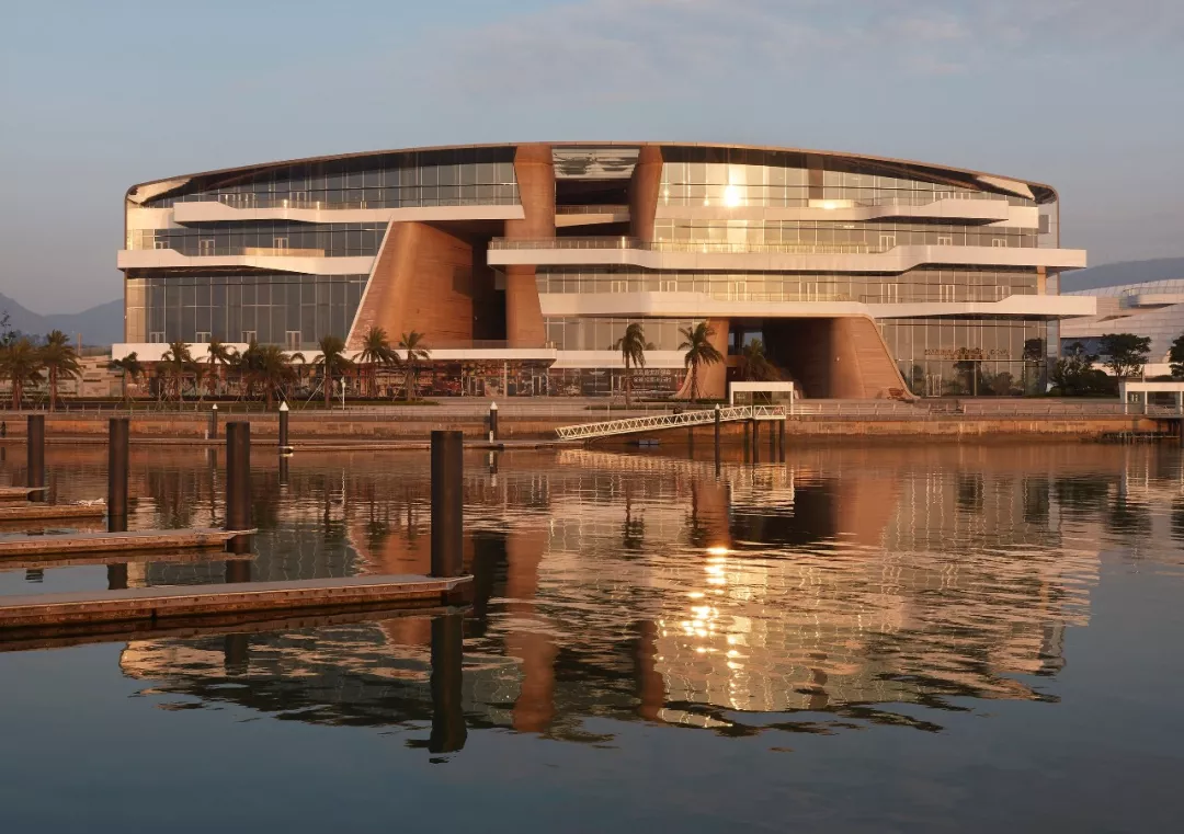 除了强烈的视觉冲击,设计还体现了桥梁连接陆海一体的理念。从陆地上走近俱乐部,一座雕塑般的景观渐入眼帘,而在水上望去,大气磅礴的建筑正脸开怀迎接海上来客,在水上洒下波光粼粼的倒影,堪称美轮美奂。