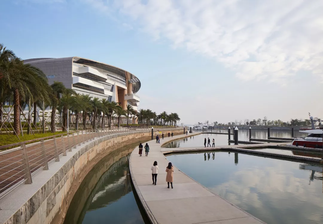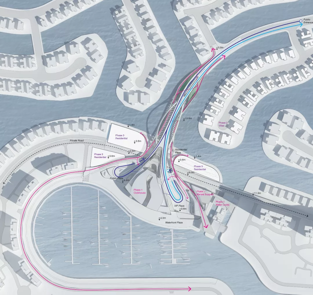 建筑的外形(及周边景观)与通往俱乐部的主道路相得益彰,营造出引人入胜的风景线。其整体效果和谐流畅,以主基础设施节点为“叶柄”(桥梁),外展呈现出美丽的扇形。这种扇形的设计还造就了大面宽的效果,让整个码头景色尽收眼底,同时还指引不同的用户群体前往各自的目的地。