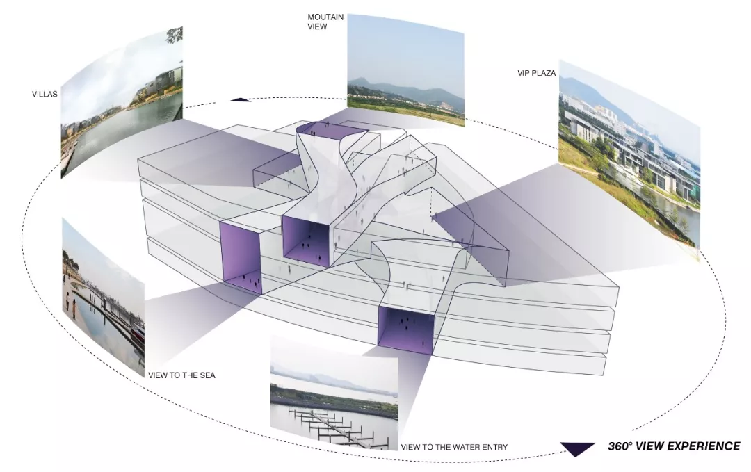 俱乐部采用的建筑空间理念,为整个项目塑造强烈的身份特征。为此,项目在正对西江的大门处设置了多个代表整个项目的建筑。从大门过桥来到俱乐部,整个水域以及停泊其间的游艇尽收眼底,营造一种弧悬于上的感觉。
