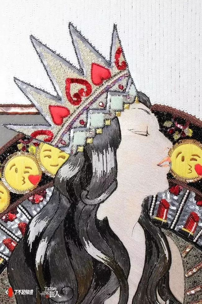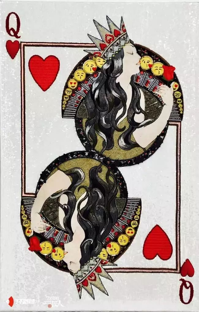 这是一幅由16人团队足足花了七八个月的时间,用了二十多种材料绣制而成的作品。《the queen》绣制的是一张正反面图案不一样的双面扑克牌Q,这使得它可以被悬空吊挂作360度的欣赏。