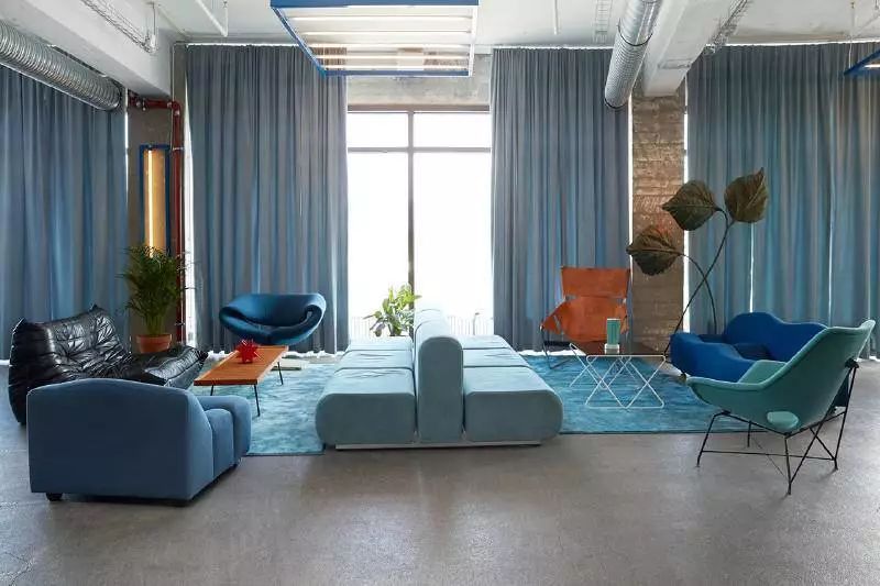 设计师保留了仓库的部分元素,比如裸露的混凝土墙面和管道,在精致的家具与粗糙元素中形成鲜明对比。