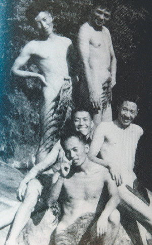 先生说,那天正是我的女儿莫非的周岁生日,他们是应我们的邀请前来庆贺。除了我以外,他们都还没有结婚,甚至都还没有女朋友。几条大汉就像欧阳修《醉翁亭记》说的那样:“觥筹交错,起坐而喧哗者,众宾欢也。”旁边的厨房里,我妻和一位姓游的漂亮小姐在忙活着。喝完酒,吃过饭,大家商议去爬山。但游小姐告诉我们,附近山谷中有一口深潭,水色澄碧,人迹罕至,可以游泳。大家都是三十多岁的年轻人,精力旺盛得不得了,全部接受游小姐的建议——游泳去!走了半个多小时,一看的确是常人不到之处,不但风景殊佳,而且蝉鸣声让山谷显得格外幽静。可问题也随之而来,我们都没有带游泳裤,如何是好?这时候,只听商禽一声吆喝:“这样的荒天野地,要什么游泳裤?脱吧!”然后第一个脱得精光,跳进了深潭之中。我们也一个个效法,成了浪里白条,只有不会水的辛郁在浅水处游玩。游累了,我们都躺在沙滩上晒太阳,许世旭拿出相机来拍照。开始大家面面相觑,集体祼泳就已经惊世骇俗了,如果再拍裸体照,那不成了花花公子吗?但是既然祼泳了,又有什么可怕的呢?国外不也有天体浴场吗?我们只能算是在台湾这个小岛上,做第一个吃螃蟹者吧?拍第一张照片时,痖弦还摘了一片水姜花叶子将私处遮盖,第二张大家根本无所顾忌,一个个抬头挺胸,在镜头下毫无羞涩地摆出各种姿势,显示男子汉大丈夫的体魄,只是每个人都将双腿夹得紧紧的——毕竟还是中国人嘛!