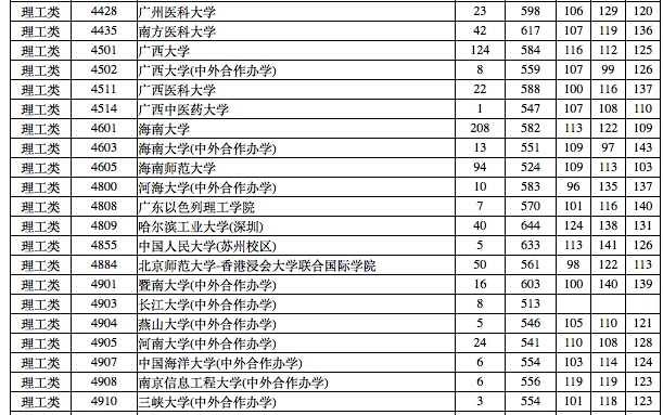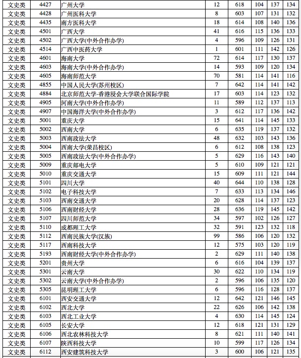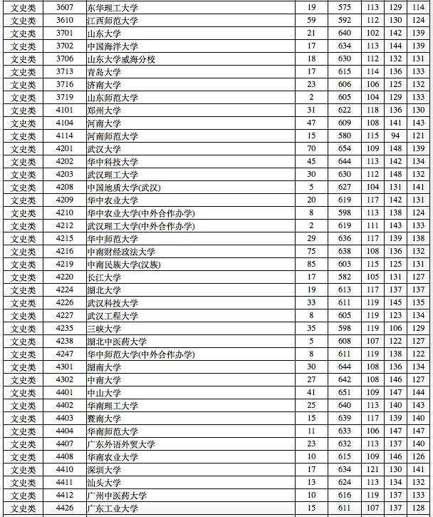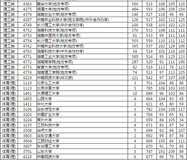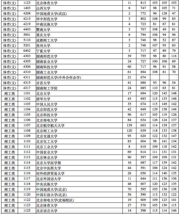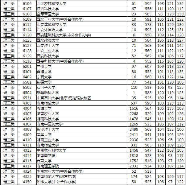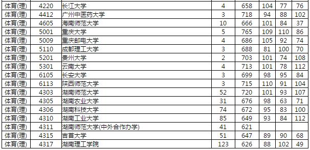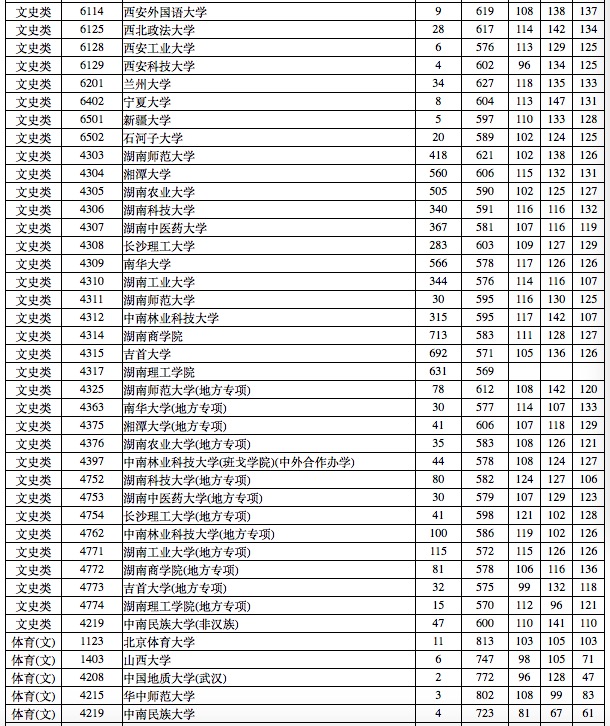 省内高校,文科前五位是:湖南大学644分,中南大学642分,湖南师范大学621分,湘潭大学606分,长沙理工大学603分;理科前五位分别是:国防科技大学644分,中南大学630分,湖南大学622分,湖南师范大学596分,长沙理工大学568分。
