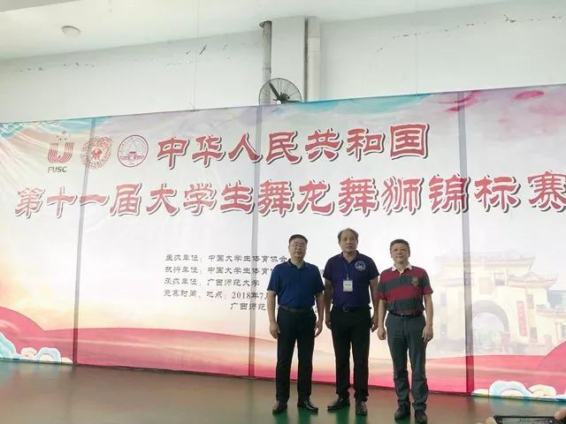 中国大学生体育协会舞龙舞狮分会常务副主席兼秘书长 、第十一届全国舞龙舞狮比赛总裁判长黄益苏为该校选手颁奖、合影,并赞誉我校龙狮队是“湖南人的骄傲”