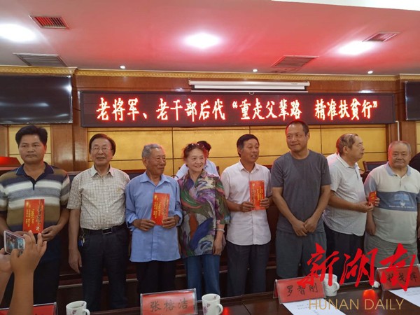 7月21日的平江,天高云淡,山青水碧,喜气洋洋。平江起义90周年到来之际,山城迎来了一批特殊的亲人,他们是平江起义、秋收起义老红军、老干部的后人们,其中有78岁的钟伟将军之子钟戈辉,有原江苏省委书记江渭清之子江旅安及其8岁的双胞胎外甥孙。有共和国开国上将钟期光之子、第三次归乡的钟德浙等。冒酷暑高温,顾不上旅途劳顿,从早上7时到晚上7时,60多位红色后代们马不停蹄地穿行于平江龙门镇、长寿镇和加义镇,开展“重走父辈路,精准扶贫行”活动,看望慰问烈士后代,送去精准脱贫的金点子。平江县委组织部干部黄乃安对记者感叹道,携手重走父辈路、精准扶贫助学行,是一次重温记忆的心灵之旅,是一腔不忘初心的革命情怀,更是一份牵挂故土、深爱人民的浓浓真情。