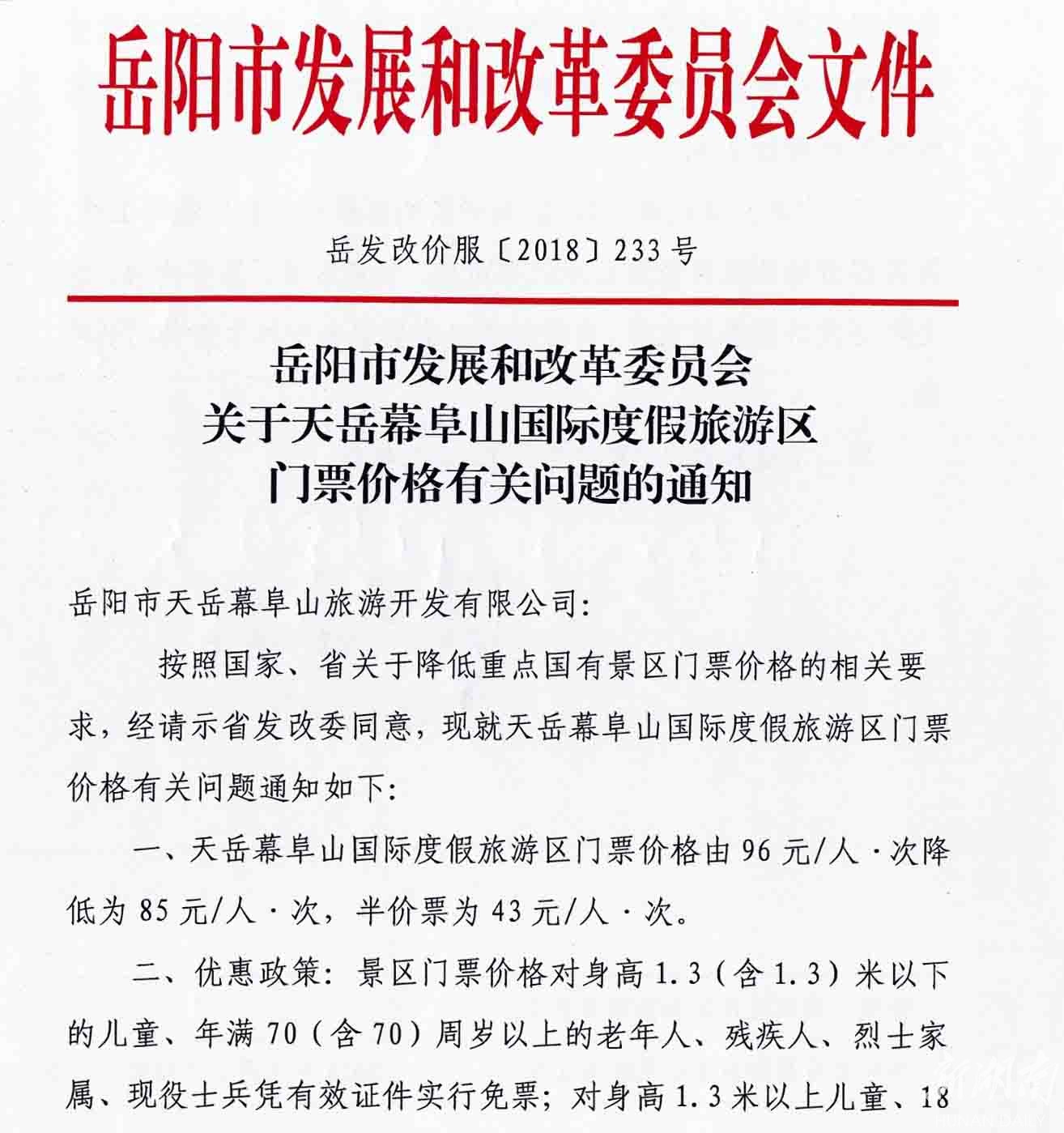 湖南日报·新湖南7月13日讯(通讯员 彭为卫 金标湘 记者 徐典波)为向“平江起义90周年”献礼,天岳幕阜山门票降价啦!今天,记者从于天岳幕阜山国际度假旅游区获悉,经岳阳市发展和改革委员会经请示湖南省发改委同意批复《关于天岳幕阜山国际度假旅游区门票价格有关问题的通知》,该景区门票价格由96元/人・次降低为85元/人・次,半价票为43元/人・次,从7月16日起执行。