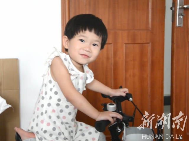 8月14日上午,穿着波点小裙子的园园,骑着她的专属自行车,在宁乡经开区某工厂的办公室里溜来溜去,不时发出银铃般笑声。