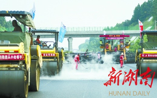 ↑8月4日,岳望(岳阳—望城)高速在进行路面施工。通讯员 摄