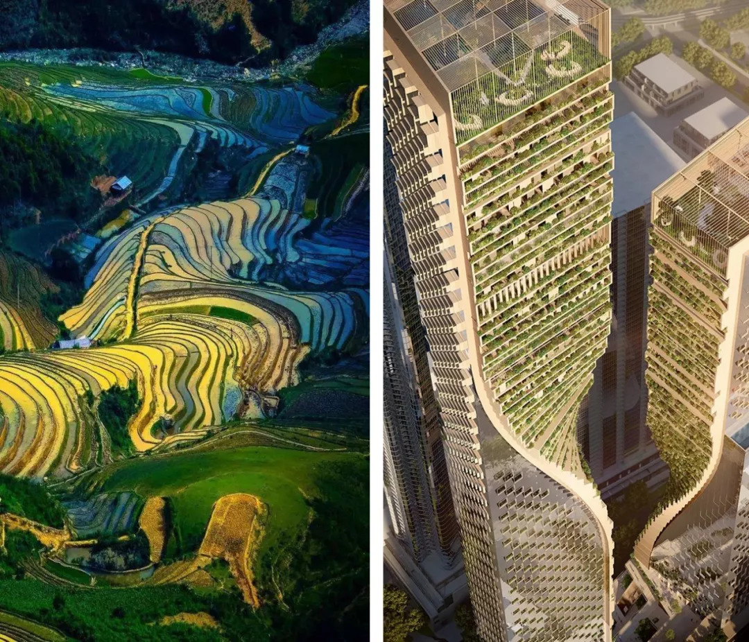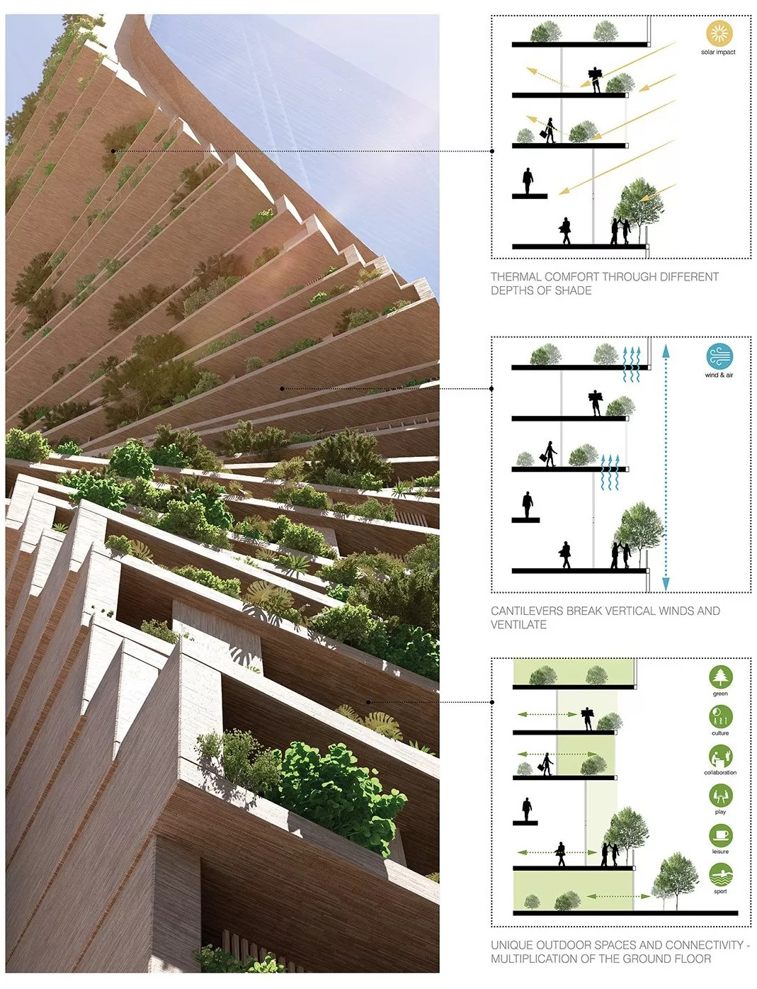 ▽旋转梯田对建筑内部的影响:形成不同程度的荫蔽、通过蒸腾水汽改善微气候、每一层形成独特的景观花园。