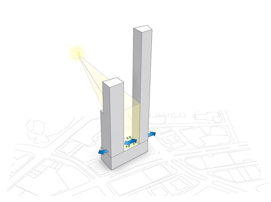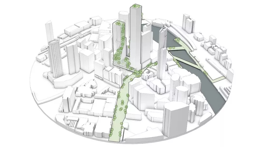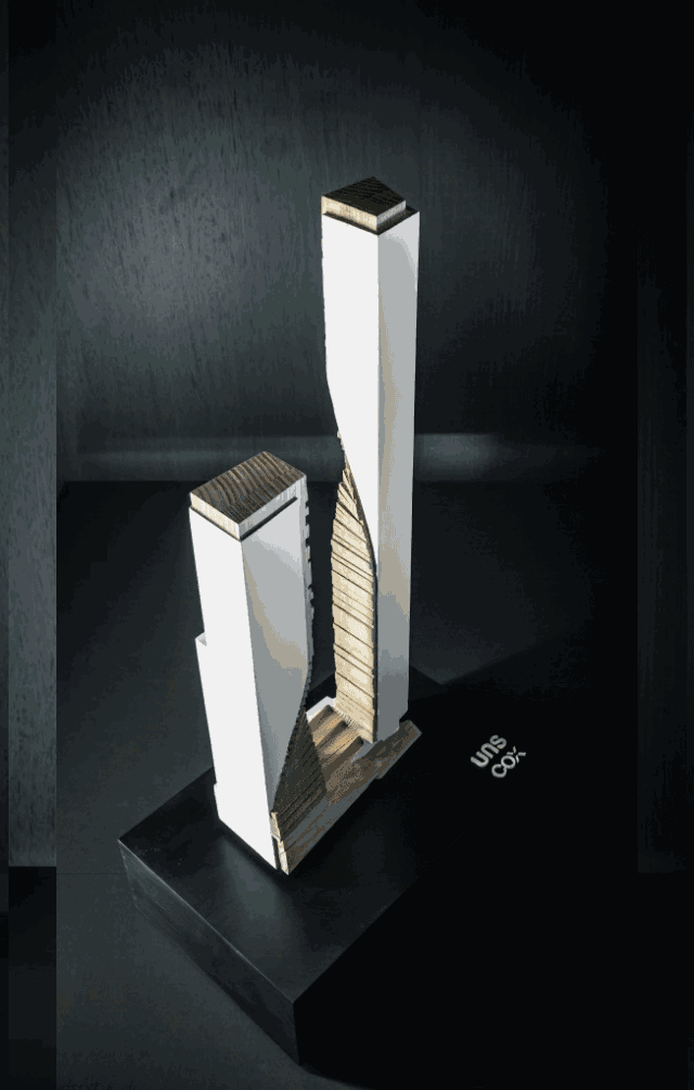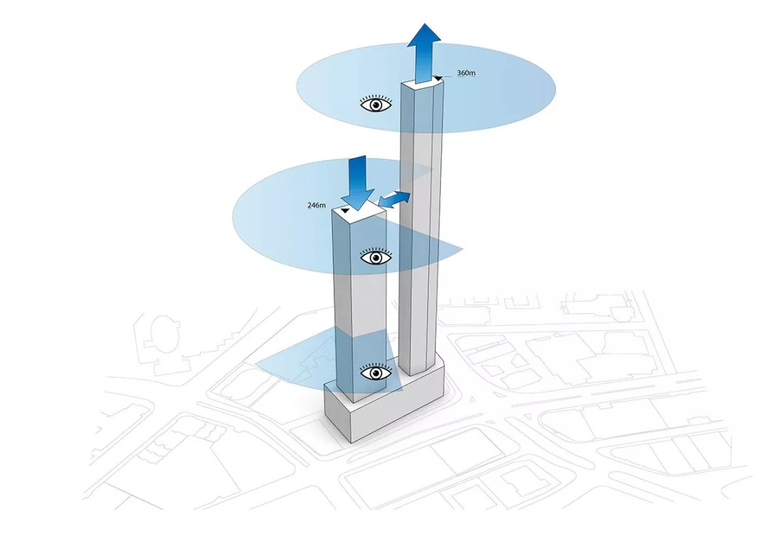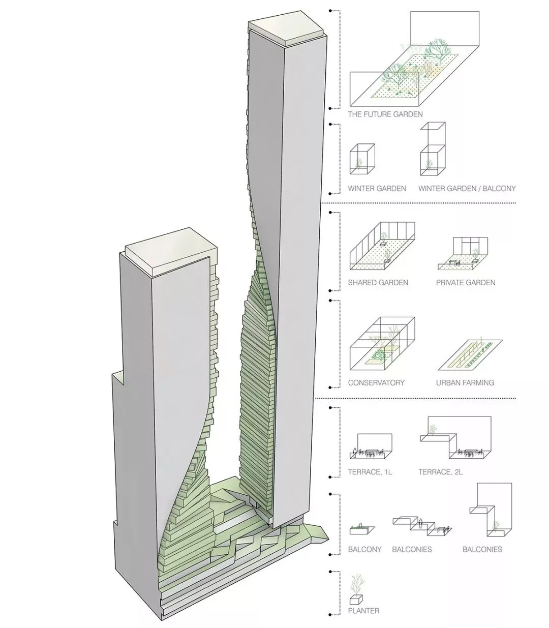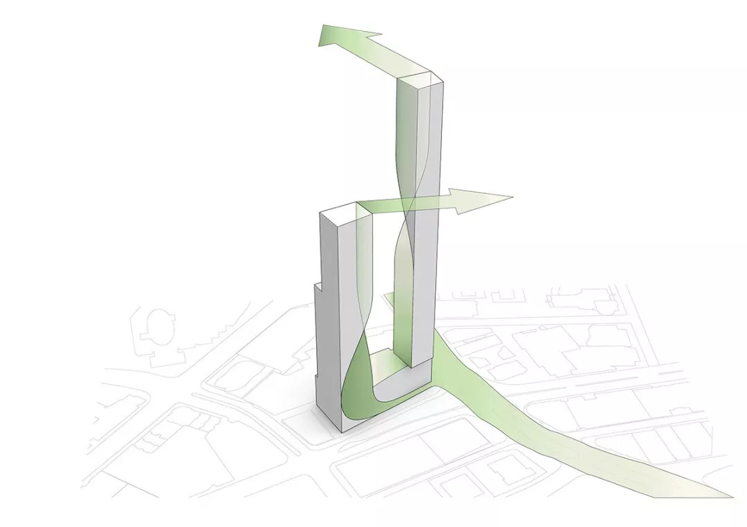 「绿脊」由两座扭曲的塔组成,使两侧的塔楼获得通透的城市视野,并显著地改善了建筑与环境的连接。