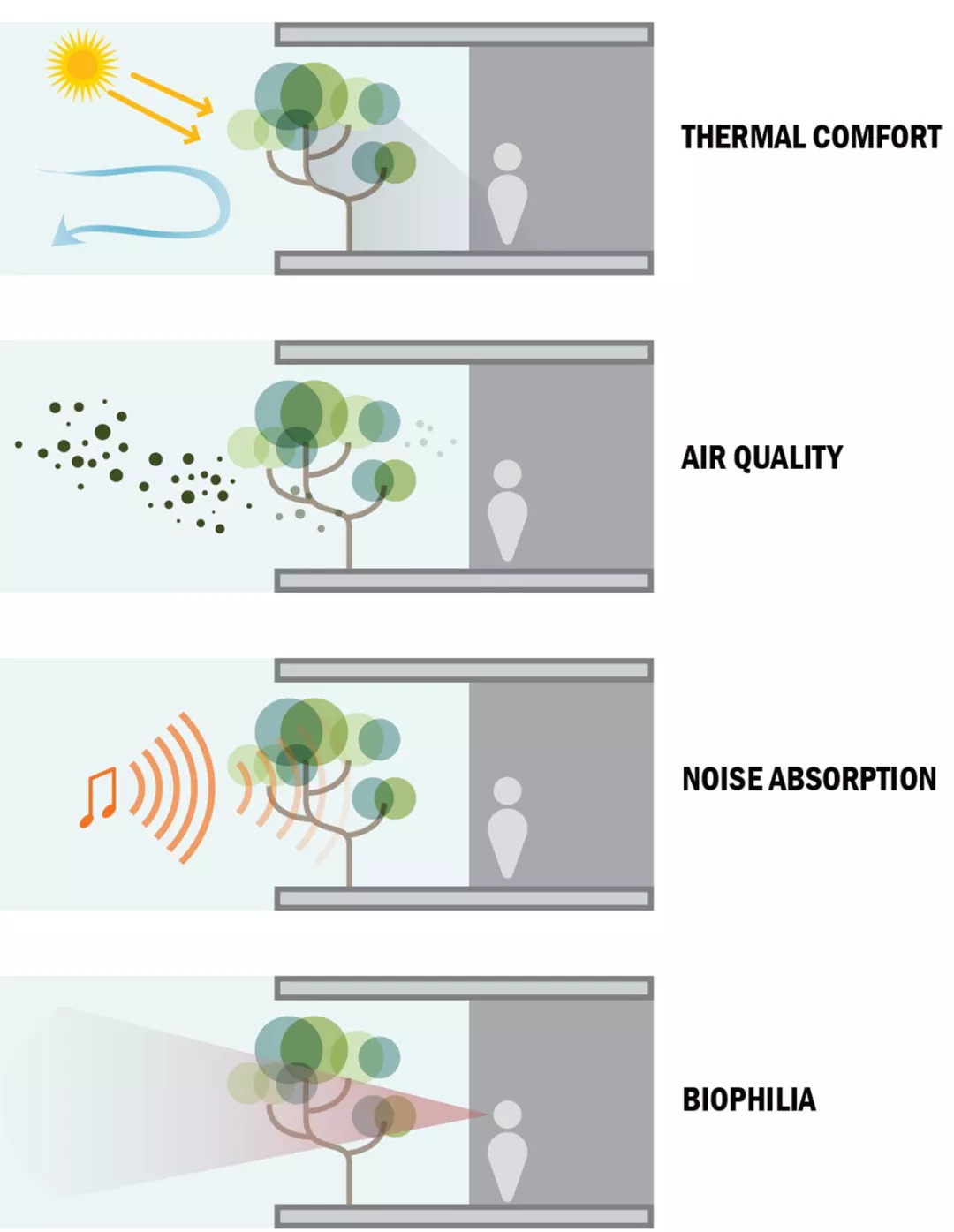 ▽绿植对室内的影响:建筑保温、净化空气、遮蔽噪音、自然之趣。