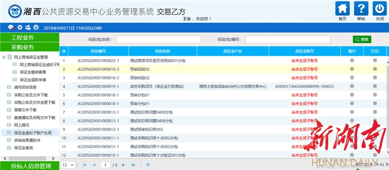 1、 登录湘西州公共资源交易中心业务管理系统,点击“网上商城保证金虚拟子账户”菜单,如下图:(系统地址http://210.22.52.184:7113/TPBidder/memberLogin)