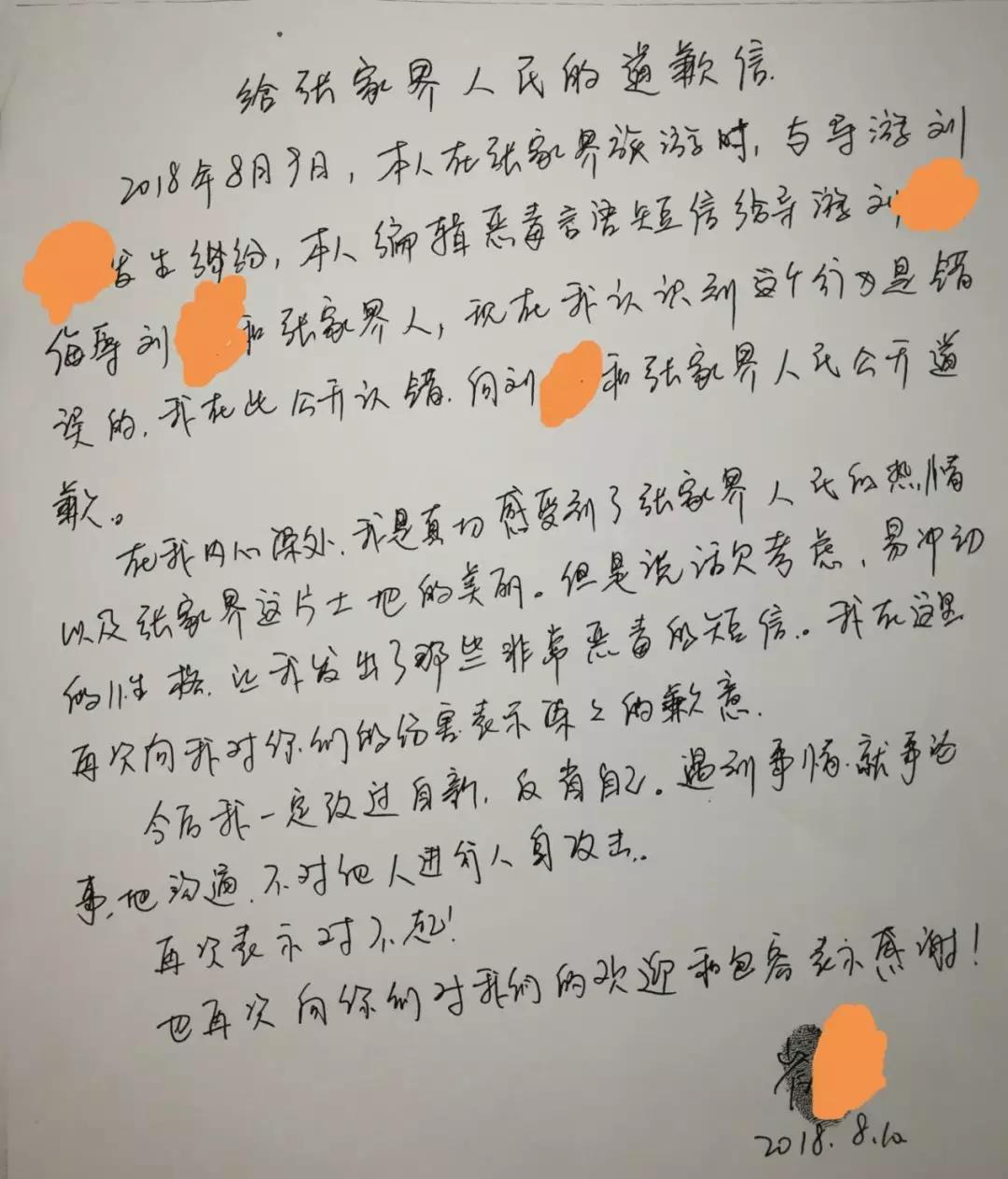 2018年8月9日,本人在张家界旅游时,与导游刘某发生纠纷,本人编辑恶毒言语短信给导游刘某,侮辱刘某和张家界人,现在我认识到这个行为是错误的,我在此公开认错,向刘某和张家界人民公开道歉。