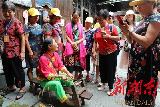 在古村落,高高的封火墙、闸子门,结构紧密封火马头墙四合院,光滑的青石板地面,形态逼真的窗雕木刻,古韵犹存的巷道,让游客们不停的按下快门、定格画面。当地村民还身穿精美的瑶族服饰,在古民居为游客展示打草鞋、打花带、纺车、纳鞋底等原生态生活场景,并与游客热情互动。“这里的古民居保存得很完整,中西合璧的建筑很有特色,特别是耕读文化和家风家训让我印象深刻。” 从长沙和家人一起过来游玩的黎利告诉记者,这是第一次来到五宝田,但这里的山水、古村落和文化底蕴给她留下了深刻的印象。她还特地买了一条当地村民手工编织的花带,来纪念这次难忘的美丽乡村行。