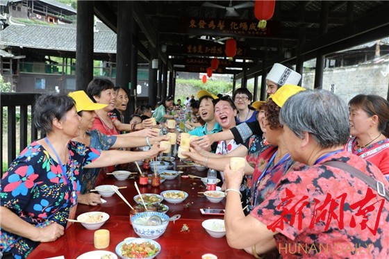 当天,当地村民还为游客们准备了稻花鱼鱼干、瑶乡竹筒酒、粉糍粑、“驴打滚”等特色美食,以及稻花鱼、毛狗肉、农家肉、家常豆腐等丰盛午餐,让游客们在溪水而过的风雨桥上品瑶乡美食、喝瑶乡美酒,别有一番风味。“从参加稻花鱼节开幕式,到仙人湾渔业村的篝火晚会,再到游五宝田古村落,这次的行程安排得很充实,一路过来,好看好吃又好玩,全家人玩得很开心!”来自广州的游客覃明这次是带着父母、妻儿一起过来游玩的,他表示,回去后要跟朋友好好介绍辰溪的山水和美食,有空和朋友再过来好好玩个遍。