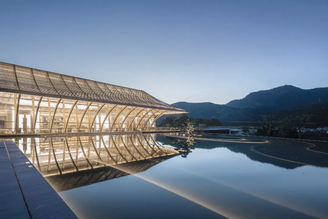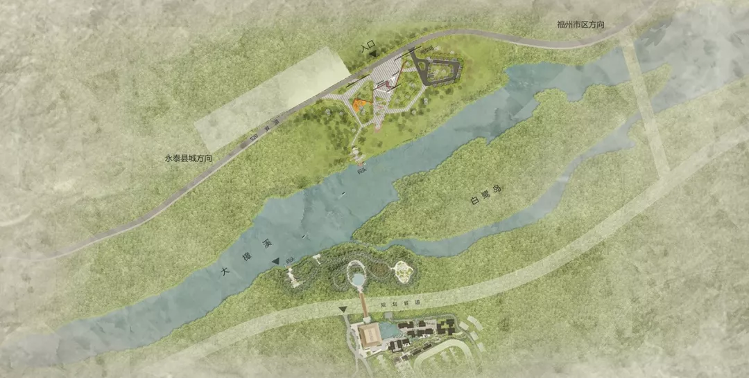 泰禾青云小镇示范区西临大樟溪,建设初期,四周交通闭塞,陆路难以直达,来访者需要在对岸乘坐轮渡抵达目的地。因此,水陆交替所造成的不便成为设计的首要难题。建筑师巧妙化弊为利,改造示范区北侧的停车场和码头,将其作为路径的起点,将水上交通纳入到访建筑的游历体验。乘船而行,两岸风景尽收眼底。及至上岸,竹林小道,曲径通幽,拾级而上,豁然开朗,映入眼帘的便是售楼处。