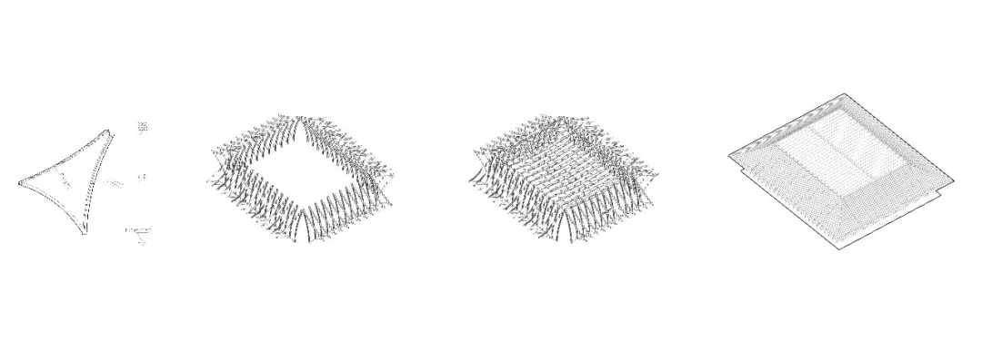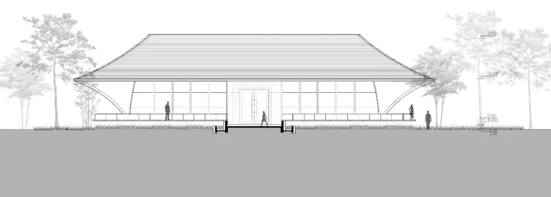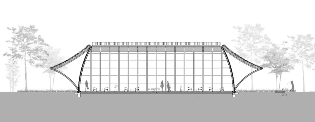 建筑整体采用钢结构,依照宋代建筑屋檐的比例提取三角形支撑作为主要的形式元素,并对这一特征进行有秩序的重复,形成售楼处的主体结构体系,同时,为了营造大跨度的通敞空间,屋顶采用鱼腹式桁架连接竖向支撑桁架。屋檐设计为镂空百叶,一是应对当地台风的解决方案,二是旨在用百叶替代封闭墙体,以保证内外视线通透。