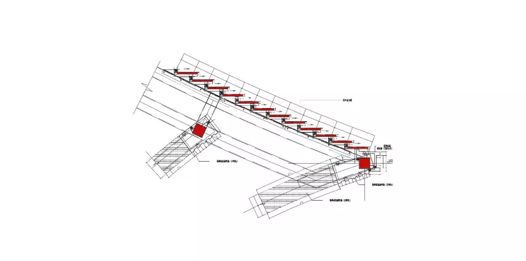 建筑形体与外观的纯粹简洁是设计的目标,建筑师将一切繁琐的功能构件隐藏。屋顶排水和屋檐排水成为首要挑战。通过设置屋顶排水天沟,将雨水管隐藏在建筑四角柱中,可以将屋顶的水排到地面。每片屋檐百叶设计了排水坡度,并在内侧设置了挡水。在雨水不大的情况下,屋檐下的室外空间基本不受雨水影响。通过排水的精细化设计,最后达到了建筑师追求的纯粹简洁效果。