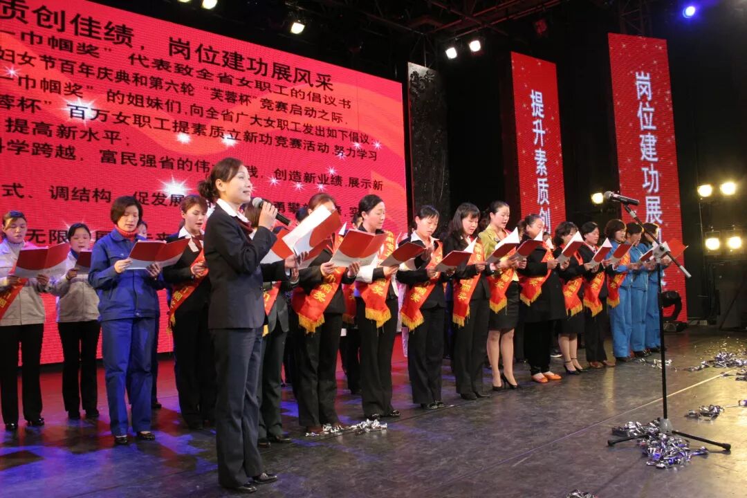 2010年3月8日 , 全省第五轮“芙蓉杯”女职工素质达标竞赛颁奖典礼暨第六轮竞赛启动仪式在田汉大剧院隆重举行,图为全省十大杰出标兵岗代表在第六轮竞赛启动仪式上宣读倡议书。