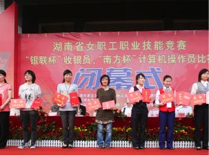 2011年10月 , 省总工会联合省人力资源和社会保障厅在株洲举办全部由女选手参加的“银联杯”收银员和“南方杯”计算机操作员两项竞赛,全省各市州、各产业共选送27支代表队、91名选手参加比赛。各工种前十名选手荣获湖南省芙蓉百岗明星、湖南省技术能手、湖南省五一先锋称号。