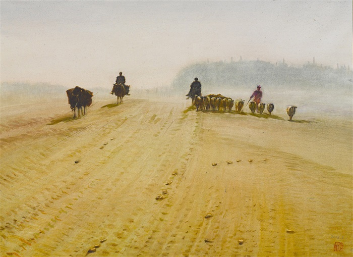 另外一个就是气,包括气势和气韵两个维度。大家都说水彩画可能是一个小画种,但是我们在很多的作品当中,可能他的画幅不大,但是它的场景和气势很大。中国文化里面还有很重要的一点,就是小中见大。小画要画大,大画要画小,大画要能缩小,小画要画的开,我们可以看到他画的那种西域的广阔和气韵。大画很精致,小画有气度。