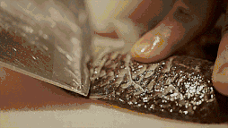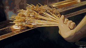 “穿串的时候两块鸡肉中夹一颗蒜,在炭火的烤炙下,大蒜表面失去水分,变得酥脆,内里变得软糯,二烯丙基硫化物经过高温散发干净,不再有辛辣味,不停的吸收鸡块的油脂,蒜香逼人鸡肉Q弹,解腻神器战神油便是它了。”