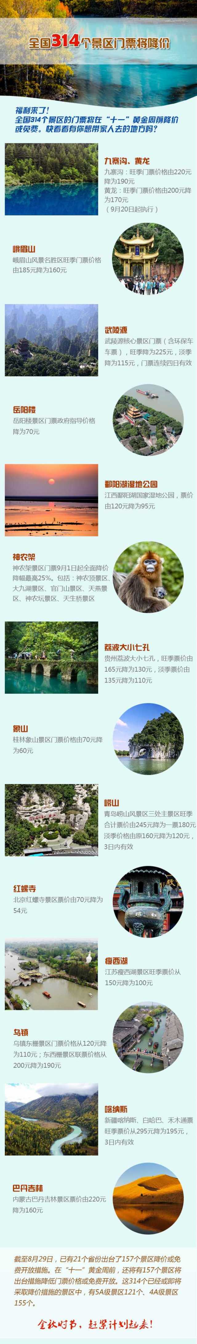 爱旅游的朋友福利来了!全国314个景区的门票将降价或免费。这314个已经或即将采取降价措施的景区中,有5A级景区121个、4A级景区155个。