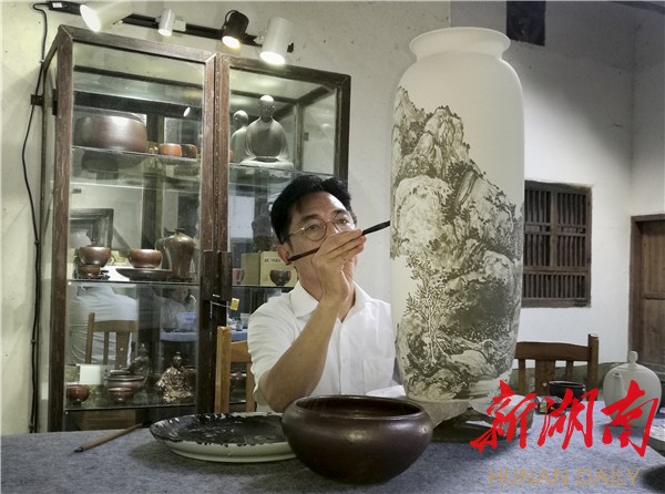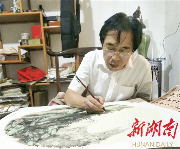 1991年,他迫于生计,去到平江有名的企业白玉扇厂做起美工,勤笔不辍,最多的时候一天画260把扇子,比一般工人多了几十把,每天多得辛苦钱。如此画了7年,他从未懈怠,所得收入大都用于买笔墨纸砚、习字绘画。