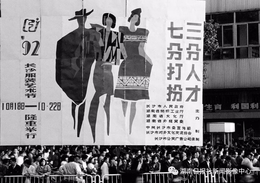 1992年10月18日,92长沙服装艺术节启幕,海报上“三分人才 七分打扮”的标语体现了当时人们对于服饰装扮的重视。谷一均 摄