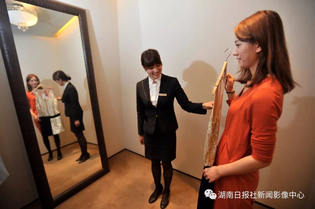 改革开放进入新阶段,中国服饰文化很好地满足了人们在不同时间、不同场合的着装需要。2014年3月19日,长沙市某百货商场,一位客人对着镜子试服装,导购贴心服务。田超 摄