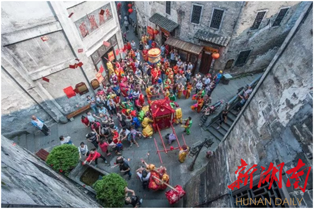 五星广场的“洪江婚嫁”节目,是古城游的一大亮点,向游客展示具有洪江特色的婚嫁习俗,老爷小姐丫鬟媒婆各司其职,游客每每被逗得捧腹大笑。国庆期间,节目加量升级,不仅男游客可体验抢绣球当乘龙快婿,女游客还能体验一把坐花轿、哭嫁、拜堂的习俗。