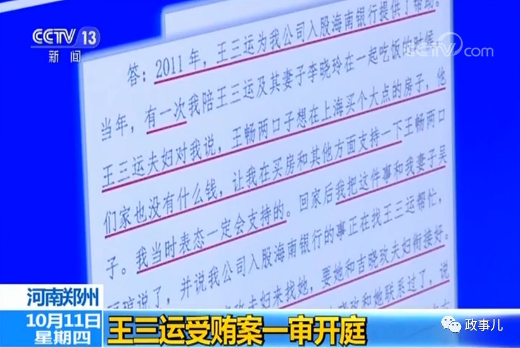 “2011年,王三运为我公司入股海南银行提供了帮助。当年,有一次我陪王三运及其妻子李晓玲在一起吃饭的时候,王三运夫妇对我说,王畅两口子(王畅为王三运之子)想在上海买个大点的房子,他们家也没有什么钱,让我在买房和其他方面支持一下王畅两口子。我当时表态一定会支持的。回家后我把这件事和我妻子吴丽琼说了,并说我公司入股海南银行的事正在找王三运帮忙。”叶简明在供述中称。