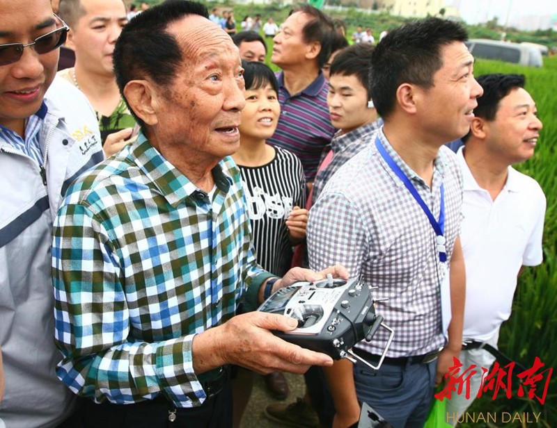 (2014年9月13日,袁隆平院士使用遥控器操控飞行器喷灌杂交水稻试验田。当天,珠海羽人飞行器有限公司赠送袁隆平院士2架农用飞行器,庆祝袁隆平院士杂交水稻研究50周年。湖南日报记者 赵持 摄 资料图)